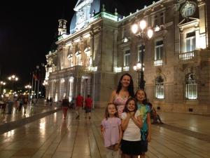 I walked four miles today. That seems to be the average, if I’m not cycling to save time (certainly not for any velocity or muscle improvement, always having to weave through crowds on sidewalks or stop at a crosswalk to let pedestrians pass). More importantly, my girls walked over two miles, mostly between ten and eleven at night, from the crowded downtown area where we stopped to take pictures of the city hall and the giant flag of Spain, where we tried sardines and anchovies and lamb chops, where we celebrated our new-found freedom of me having gainful employment, where I carried my grandmother’s spirit at the back of every thought.