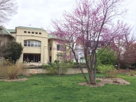 blooming redbuds, purple lawn,