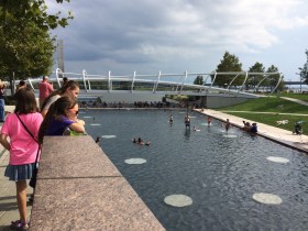 a riverfront fountain park,