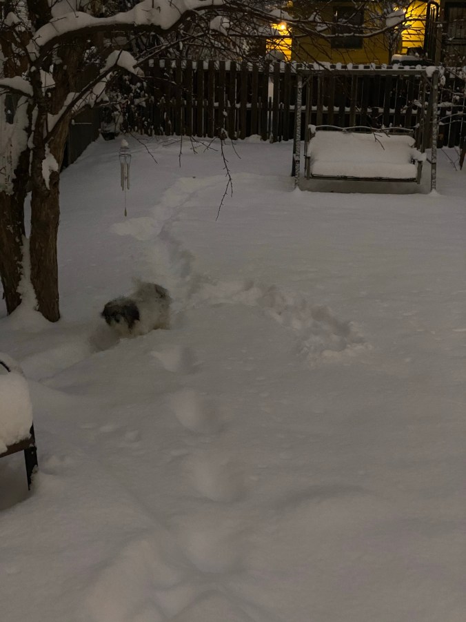 So now I have a snowy weekend with this snow-loving Pomapoo, my money, and my family safe at home.