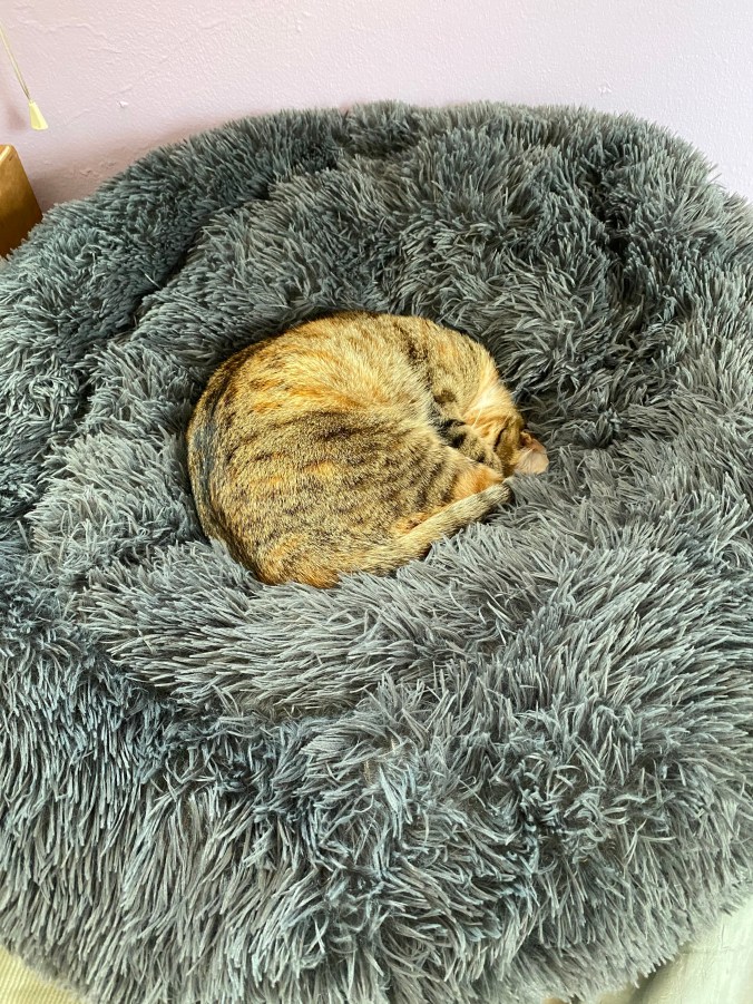 curled into this ball on a bed