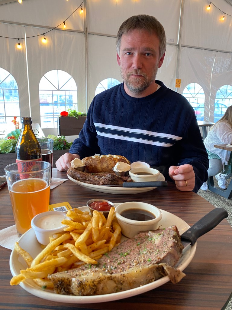 Those blue eyes could pierce you through Prime Rib Night at Bull and Bush, our semi-favorite place, marred by COVID and patio seating (his mar, not mine).