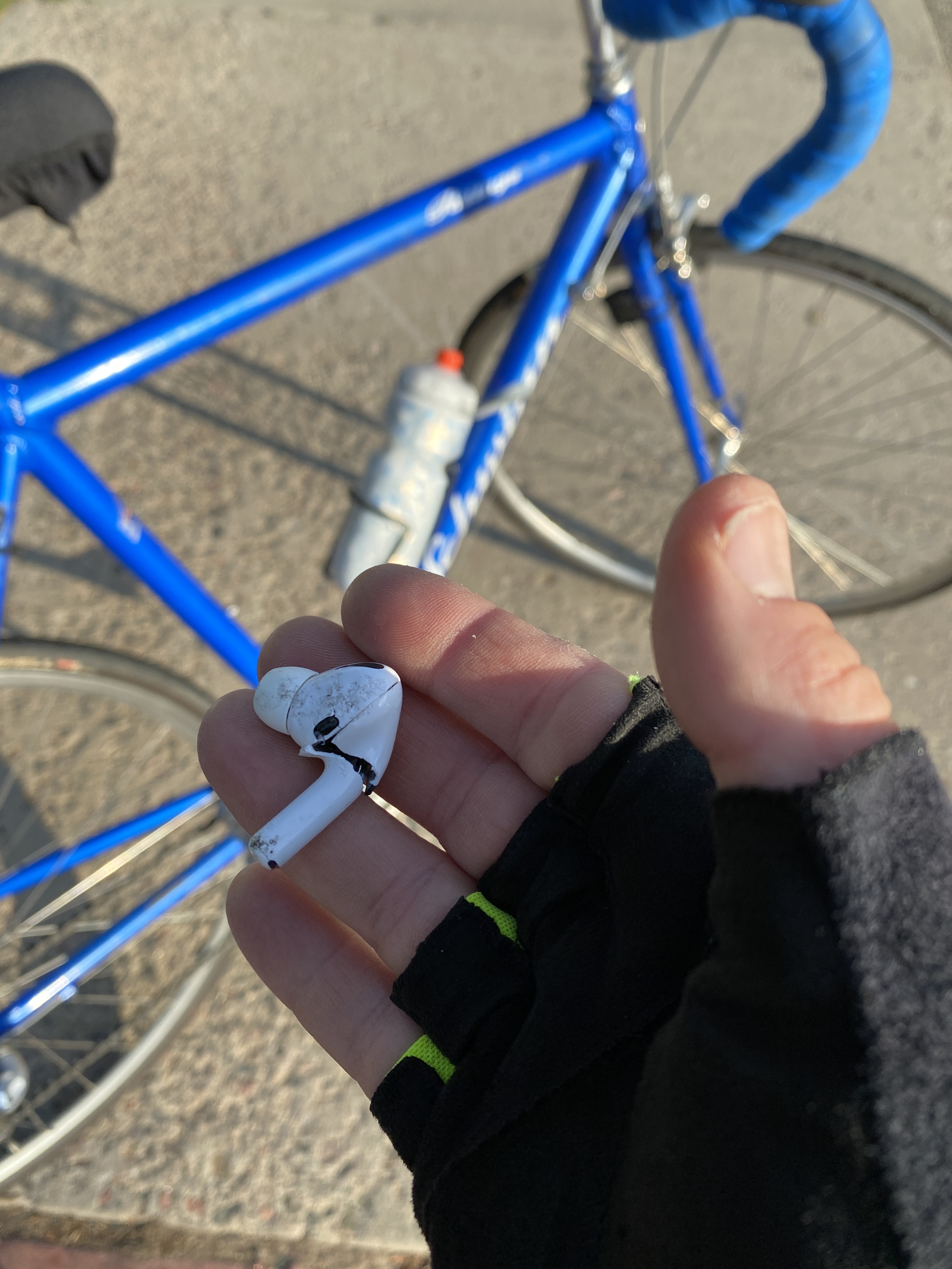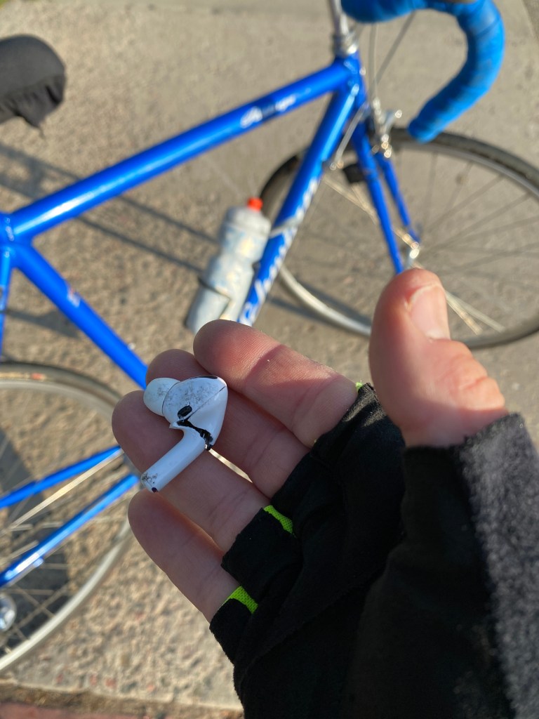 I start to ride away and feel the absence of sound in my ears, the awful audiobook not plaguing me, and look down into the street where multiple cars have largely ignored our small accident, and there they are: my smashed AirPods, run over again and again while I watch, before the traffic stops and I have a moment to hold their beautiful lack of sound in my palm.