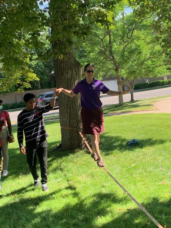 Instead I send a pic to Bruce of my broken AirPods and remind him that he has a pair at home he can’t wear because they were hurting his ears, and I ride two more miles with a golf-ball-sized bump on my elbow and beg the school secretary for ice and watch all the kids and all the teachers do the slack line, knowing I will fail if I try until Muluta, behind his long eyelashes and his red hood and his Congolese accent, says upon responding to my question, “Did you like it?”: