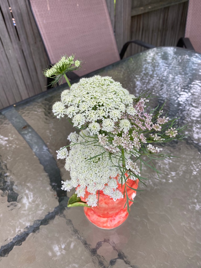 I listen to my audiobook as I rake, listen until it’s done. Each child comes to the door to see what I’m doing, but none of them will agree to help (gardening is not on their chore list).
